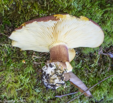 has a beautiful yellow-based pileus that looks as if it was sprinked with reddish-plum colored powdery scales on the cap and the stem. The cream colored finely serrated gills are close. The spore print is off-white to cream. The stem has a paler cream zone at the apex. Like other species of Tricholomopsis, this mushroom grows from rotted conifer logs and stumps. In Great Britain, it has the common name of ‘Plums and Custard’ and is apparently edible when cooked. Our version seems to be different and will someday undoubtedly be sequenced and perhaps given a new name. Here it can be found in summer through autumn. Edibility unknown. It is in the Tricholomataceae family of the Agaricales order.