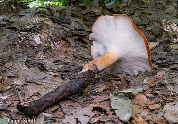 Polyporus radicatus grows from the ground and is probably attached to the dead roots of deciduous hardwood trees. The cap is yellowish-brown to red-brown, and velvety. The pores are white, shallow and somewhat decurrent in running partway down the similarly colored central stem. They do not change color with handling. The stipe that is underground is blackish and tapers down toward its attachment point. Polyporus radiactus is in the Polyporaceae family of the Polyporales order.