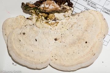 Trametes gibbosa is commonly called the ‘Lumpy Bracket’. The top surface is gray or white and sometimes older fruiting bodies are also covered in algae. The hymenium has elongated pores. Spore print is white. This is a white rot fungus commonly found on dead hardwoods, especially beech. Trametes is in the Polyporaceae family of the Polyporales order.