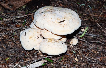 Unless there are several species going under one name, this Russula related species is cosmopolitan appearing in many parts of the world in mixed and coniferous forests with pines. The cap is white to pale buff. This mushroom has a yellowish to pale greenish-yellow tiny pored hymenium that runs down the stem. All parts are subject to staining yellow with bruising or handling. When quite young, it is said to be edible, but otherwise rather bitter and potentially toxic if mildly so. Eating older specimens will likely result in gastrointestinal distress.