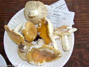 looks very similar to Russula flavida, which has a yellow rather than a white stem. The dull yellow cap is convex becoming flat with a somewhat darker shallow depression. The cuticle does not easily peel. Flesh is white. Its close gills are white to cream discoloring or spotting yellowish-brown to rusty-brown with handling. The white smooth stem becomes yellowish to brownish. Spore print is whitish to cream. Russula ochroleucoides is mycorrhizal with hardwoods, especially beech and white oak. Taste is slightly acrid and oily. It is in the Russulaceae family of the Russulales.