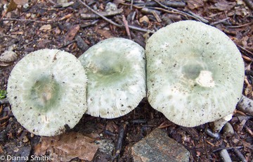 "Green Quilt Russula” Crustose Dry, GREY-GREEN quilted cap, sometimes with ochraceus patches. May be paart of a complex of look-a-like mostly greenish and white russulas. White gills close, fragile. White spore print. Found in mixed woods. Mycorrhizal with hardwoods and conifers. Good edible.