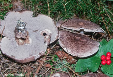 The literature on the various Sarcodon species in North America is confusing and awaits further treatment clarifying their mycorrhizal hosts (hardwoods or conifers) and their morphological features. Generally speaking they are reddish-brown with scaly caps, an inrolled margin and a depressed center. Their spines are tan with white tips and darken with age. They run down the stem which in these examples end in a green base. It is in the Bankeraceae family of the Thelephorales order.