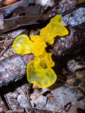 Tremella mesenterica grows from debarked dead hardwoods. It is a 'Witches Butter’ that parasitizes the mycelium of the crust fungus, Peniophora. The similar-looking Dacrymyces chrysospermus (Dacrymyces palmatus) grows on debarked conifers and has a white mycelial attachment point. Tremella mesenterica is an edible fungus that differs from Tremella aurantia in having glossier lobed globs or fans than the latter. Unlike Tremella aurantia, which is parasitic on mycelium of Stereum, Tremella mesenterica is parasitic on species of fungi in the Peniophoraceae family.