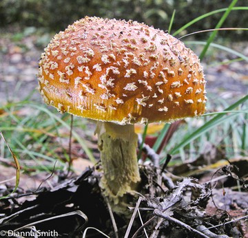 is a primarily a conifer associate, although it can also be found with hardwoods. It ranges in color from bright orange yellow to paler yellow with white to tan warts and often marginal striations with maturity. The white to cream gills are close to crowded and are narrowly attached to the stem. There are many shorter gills of varying length and distribution. The shaggy stipe can be yellow, cream or white. The skirt-like partial veil color also is variable, and located on the upper stem. The bottom f the stipe and the upper part of the bulbous base bear rings of volval material.