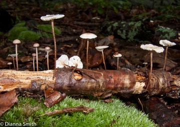 is a common decomposer of both wood and leaf litter. Large mycelial mats can be found at base when in leaf litter. White convex cap becomes flat with a bumpy margin and is usually a little darker in the center. The gills are usually somewhat distant. The hollow stem is pale yellow or reddish-brown set becoming darker from the base upward. It has white spores. It is in the Marasmiaceae family of the Agaricales order.