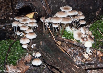 Conical brown-tan cap, often with a center nob, paler toward margin. Stipe is same color, but paler at apex. Gills white, but gradually turn pinkish. Grows in clusters on wood. The name refers to a European mushroom. What we have is (possibly a complex) undoubtedly different and will require a new name(s). It is in the Mycenaceae family of the Agaricales.