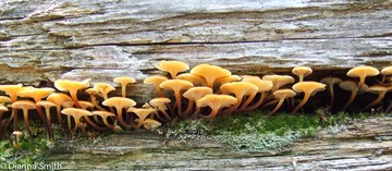 Xeromphalina campanella is a small nonpoisonous mushroom that grows on rotting conifer wood. the yellow-brown to orangish cap is thin fleshed, broadly convex with a central depression and striate margin. its yellow to pale orange gills are subdecurrrent and subdistant and have veining between them. The usually curved stipe is reddish-brown going down to its furry base where attached to the substrate and yellowish at the apex. Spores are buff in mass. They tend to grow in cespitose groups. It is in the Mycenaceae family of the Agaricales.