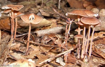 Looks like Gymnopus dichrous, but grows from leaf litter rather than sticks and logs. Cap red-brown to brown, wrinkled, lined in maturity. Gills whitish, somewhat distant, and attached becoming pinkish in age. Stem flares at apex. Bald above, velvety below. Buff becoming darker reddish-brown to black toward base with maturity. Taste bitter. It is in the Omphalotaceae family of the Agaricales order.