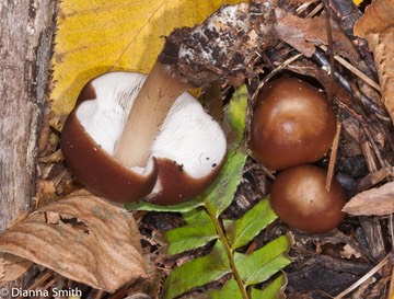 Rhodocollybia butyracea like Cannopus acervatus, this species is a decomposed of conifer wood. Tends to be found with pines. Cap is more red-brown than similar appearing yellow-brown Gymnopus dryophilus. White stem is also shaped more like a club. White close gills often exhibit finely jagged edges, unlike Gymnopus dryophilus.