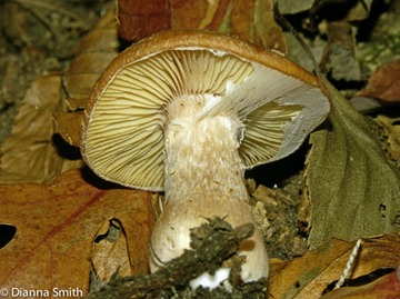 Solitary or in groups on the ground, usually under hardwoods and attached to rhizomorphs. Hairy cap and swollen base. Has cobwebby veil similar to Cortinarius mushrooms.
