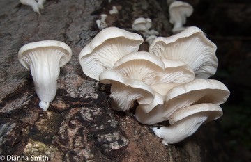 Pleurotus pulmonarius is somewhat smaller and thinner fruiting bodies than cooler weather fruiting of Pleurotus ostreatus. Slightly greasy with marginal striate lines. White to pale tan, but no brown. Has more of a stem. Appears in summer when weather is warmer through fall and early winter. Medicinal properties: anti-tumor, anti-bacterial, possible diabetes treatment. Grows on hardwoods in eastern NA. Saprotrophic on dead wood causing white rot. Visited by fungus flies. Great in Chinese cuisine. With leeks, or asparagas, white wine, tamari. Over rice. It is in the Pleurotaceae family of the Agaricales order.