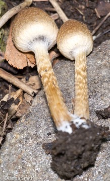 Hairy brownish caps, remnants of partial veil hang from cap margin.