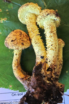 This Pholiota has a bright yellow cap and stem with scales. It has yellowish well-spaced gills that do not stain reddish-brown. Like other Pholiotas it grows on wood.