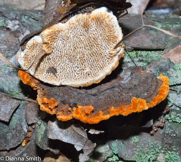 Brown rotter of conifer wood. This pretty annual can be found on dead conifer wood and on conifer lumber. Zonate and irregularly shaped cap and gills are initially shades of rusty-orange, but as the fruit body matures the cap becomes dark brown from the point of attachment outward. The margin typically remains orange. The tough maze-like to gill-like pores become paler.