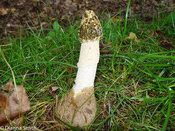 Phallus duplicatus (Dictyophora duplicata) with the gleba completely eaten. On occasion mushroom hunters are fooled into believing they have found a bleached-out morel in autumn on seeing this on the forest floor!