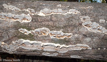 White rotter of dead mainly broadleaf trees. Thin, slightly hairy small whitish caps that become bald with age. Caps fusing as they grow horizontally in tiers and fused. Cap may change color becoming gray to brown and eventually it has a black margin. Pores are tiny and close. White spores.