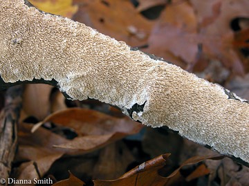Resupinate, toothed. White rotter on hardwoods. A pale cream resupinate crust fungus with poroid teeth that split and become flattened. It can be found on the side of and underneath hardwood branches and logs. When growing on the sides of wood, it can produce a small, thin, velvety, zoned white lateral cap with an an irregular margin. These are frequently seen growing in long rows. Occasionally found on conifers. It is a saprotrophic white rotter of sapwood. On live trees, such as cherry, it can be parasitic. This is in the Meruliaceae family of the Polyporales order.
