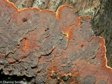 An orange to orange-pink waxy, gelatinous wrinkled crust fungus that expands outward from a central point. Can be found on the underside of dead wood of both deciduous and on coniferous trees virtually throughout the year, but it is most visible in late autumn. This is in the Meruliaceae family of the Polyporales order.