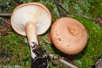 Flesh and latex are white but change to bright YELLOW on cutting. Develops dull vinaceous-brown stains over most of mushroom, including the gills. Unlike Lactarius chrysorrheus, which grows under hardwoods, Lactarius vinaceorufescens grows under conifers. Not a good edible.
