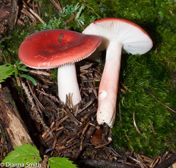 has a viscid to dry cherry red cap that starts out convex to broadly convex and then becomes somewhat depressed with maturity. The cuticle peels half way to the disc. Its white attached gills are minutely fibriate, which means they have serrated or saw-toothed edges. Spore print is white. It has a white stipe flushed with red dots. It can be found in damp coniferous habitats, often growing gregariously in sphagnum moss in August and September. Taste is mild. A good edible. It is in the Russulaceae family of the Russulales.