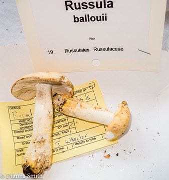 Russula ballouii can be distinguished from other brownish-yellow russulas by its dry cap and stipe and by the presence of brownish-rusty colored blotches that expand and break up as the mushroom grows. The cap pellicle resists peeling. The species has no distinctive odor, but it tastes very acrid. Gills are white to pale cream and closely-spaced. Neither the gills nor the flesh stain or change color with handling. Spore-print is off-white to cream. A drop of KOH on the cap skin will turn brownish-red. This russula is more common in the south and to the west of the northeast.