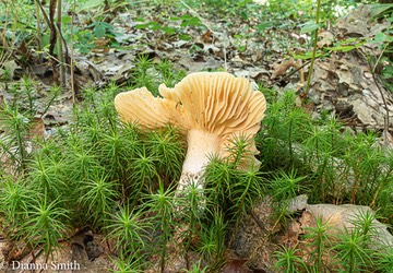could be mistaken for a hygrophorus (waxy cap mushroom). Cap is waxy to the touch, slightly tacky, granular, straw yellow to orangish-yellow. Cuticle does not easily peel. Distant, waxy, wet, broad creamy to yellow attached gills that spot rusty-brown. Stem also feels waxy and is white to yellowish discoloring to rusty-brown. Mycorrhizal with hardwoods, especially beech and oaks. It is in the Russulaceae family of the Russulales.