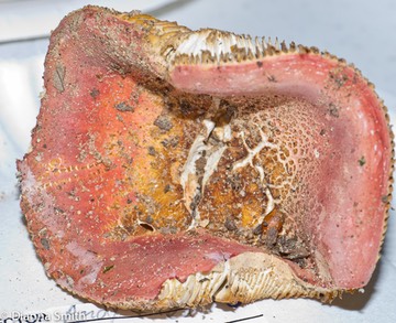 is dry, slightly velvety and pinkish to pinkish-red fading with age to pinkish yellow, orange or cream colored, especially in the center, where cracks may develop. Cuticle doesn't easily peel. White gills bruise brownish-yellow-orange with handling and age. Stipe is white to pale pinkish and stains brown. Spore print is white. Somewhat similar to RUSSULA pulchra. Mycorrhizal with hardwoods. Found in oak-hickory forests. Taste somewhat bitter and oily. It is in the Russulaceae family of the Russulales.