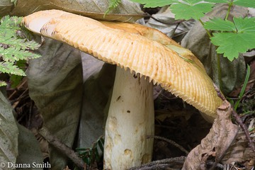 Ochre-yellow, viscid cap with marginal striations. SKIN PEELS back half way to disc. STAINS BROWN. Marzipan, maraschino cherries & almond odor turning unpleasant as the mushroom ages. Light spore-print. On ground deciduous or mixed woods. In the ‘foetid’ group of russulas, which includes Russula foetentula, Russula ventricosipes (in sand under pines), Russula mutabilis and Russula grata (Russula laurocerasi). Although the odor is initially nice, if strong, the mushroom is not considered palatable owing to its oily-acrid taste.