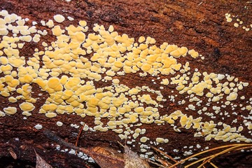 The Stereaceae family is in the Russulales order. Fungi in this group are often resupinate or partially so with a small overlapping cap. Their fertile surface is smooth, unlike that of similar appearing polypores. Stereums are saprophytic on dead branches and tree trunks. They lack clamp connections.