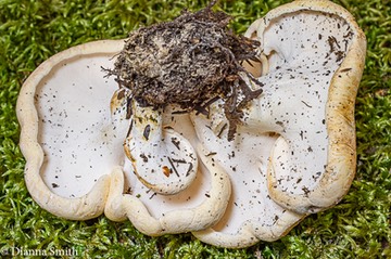 This fungus at first glance can easily be mistaken for Bondarzewia berkeleyi. Look more carefully and you may notice a few blackish-brown streaks or spots either on the surface of the caps or underneath on the cream-colored pore surface. Handling it will cause the parts touched to gradually turn smoky black. This white rotter has large fan-shaped leaves attached to a tough central stalk. It is a parasite of living hardwoods, especially oaks, and a saprotroph of dead logs, stumps and buried roots. Meripilus sumstinei has been called the ‘Giant Polypore’ (Meripilus giganteus) and the ‘Giant Blackening Polypore’. It is edible, although there are a more than a few mycophagists who turn up their noses at the prospect of eating it. If you do cook it, be prepared to see the pan blacken. The taste is perfectly fine.