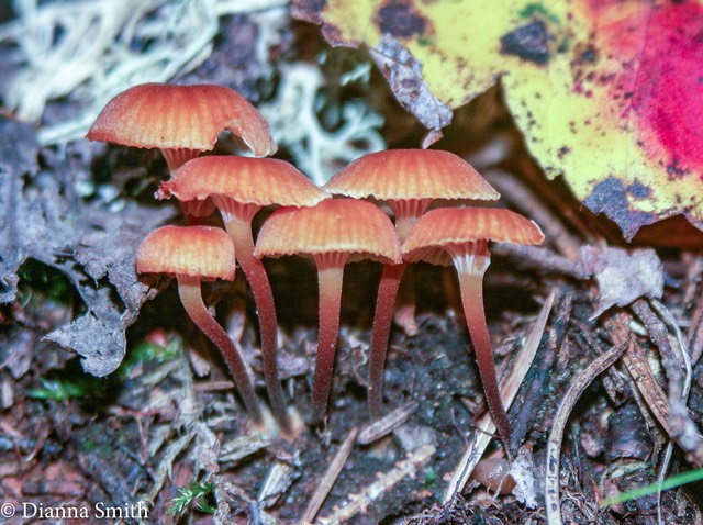 Xeromphalina campanella is a small nonpoisonous mushroom that grows on rotting conifer wood. the yellow-brown to orangish cap is thin fleshed, broadly convex with a central depression and striate margin. its yellow to pale orange gills are subdecurrrent and subdistant and have veining between them. The usually curved stipe is reddish-brown going down to its furry base where attached to the substrate and yellowish at the apex. Spores are buff in mass. They tend to grow in cespitose groups. It is in the Mycenaceae family of the Agaricales.