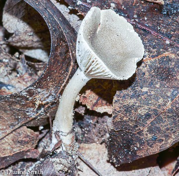 Initially dry, fibrillose, grayish-brown, darker on disc, convex becoming vase-shaped (infundibuliform) and paler on wavy margin. Gills are white to yellowish and somewhat decurrent. Stipe is fibrillose buff with white mycelium and rhizomorphs at base. A small mushroom, it grows singly or gregariously in humus under both broadleaf and coniferous trees in summer to early autumn. It is in the Tricholomataceae family of the Agaricales order.