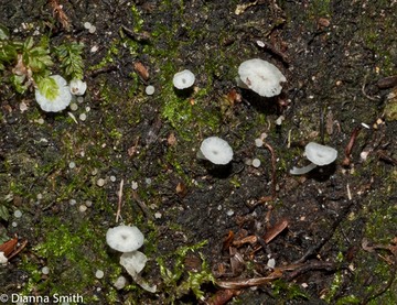 This tiny, delicate, flowery-looking mushroom is a saprotrophic fungus that digests and absorbs the nutrients in moss-covered dead wood of broadleaf trees. It has a near-translucent white cap and white widely-spaced gills with cross-veining. The stem is white and ends in a boulbous base. Its spore print is white. It may be relatively rare. In any case, it is rarely recorded, perhaps due to its small size. It is in the Tricholomataceae family of the Agaricales order.