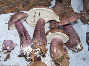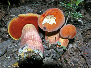 The Boletaceae family is in the Boletales order. Most sponge-pored fungi in this and related families were once determined to be in the genus Boletus. Currently, only those fungi genetically related to the type species Boletus edulis are put in this genus. Mycologists are still sorting out the relationships of these fungi to each other. We expect more names to be changed as relationships become clearer through DNA analysis. With a few exceptions, most boletes are ectomycorrhizal with plants. Two genera are putatively mycoparasitic: Buchwaldoboletus lignicola and Chalciporus piperatus. Pseudoboletus parasiticus may also be parasitic. To see details of represented boletes, please click on each photo.