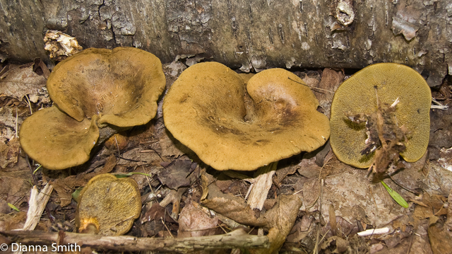 Ash Tree Bolete" Yellow-brown to olive kidney-shaped or irregularly lobbed cap with inrolled margin. Flesh tough, yellow staining blue-green to brown. Shallow tubes are yellow-ochre. Pores large and radially arranged, variable. Off-center, short stalk. Under ash trees. Has an interesting relationship with aphids. Not mycorrhizal. It is in the Boletellaceae family of the Boletales order.