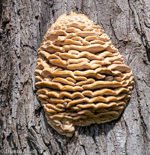 It is a parasite on the wounds of deciduous trees, especially sugar maple, beech and ash. It can also fruit on standing dead trees. From a distance, Climacodon septentrionalis looks like it is a polypore growing in tiered layers, but its spore-brearing surfaces are actually ‘toothed’ having spines rather than pores. This fungus causes rot of the tree's heartwood. This is in the Meruliaceae family of the Polyporales order.