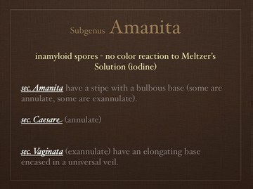 There are 7 sections total:  3 in the subgenus Amanita and 4 in the subgenus Lepidella. The species in the three subgenus Amanita groups all have inamyloid spores. The species in the Lepidella subgenus all have amyloid spores. 010-001