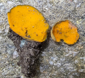 This is the only asco cup fungus in the Calocyphaceae family of the Pezizales Order. It is usually found in early spring on the forest floor among conifers. The smooth interior is pale yellow-orange to bright orange, while the outer surface is lighter in color. Mature to older fruiting bodies may have olivaceous to bluish marginal edges as seen in this photo. A vaguely rough lookalike is Aleuria aurantia, which, however, fruits later in the year.