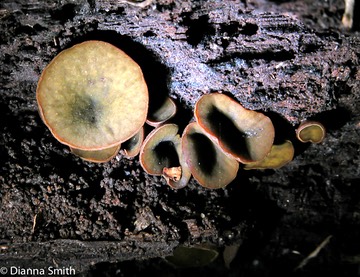 It is a multi-colored yellow and green cup fungus with a darker reddish-brown marginal edge growing on very decayed wood. It is in the Hemiphacidaceae family in the Heliotales order.
