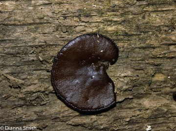 is a small brown cup fungus that grows from debarked wet dead wood, mostly of broadleaved trees. It is in the Pezizaceae family in the Pezizales Order.