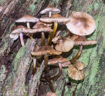 Mycena galericulata "Common bonnet" Conical brown-tan cap, often with a center nob, paler toward margin. Stipe is same color, but paler at apex. Gills white, but gradually turn pinkish. Grows in clusters on wood. The name Mycena galericulata refers to a European mushroom. What we have is (possibly a complex) undoubtedly different and will require a new name(s).