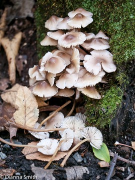 Mycena galericulata "Common bonnet" Conical brown-tan cap, often with a center nob, paler toward margin. Stipe is same color, but paler at apex. Gills white, but gradually turn pinkish. Grows in clusters on wood. The name Mycena galericulata refers to a European mushroom. What we have is (possibly a complex) undoubtedly different and will require a new name(s).