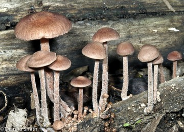Gymnopus dichrous looks like Gymnopus subnudus, but grows from sticks or logs rather than from leaf litter. Cap red-brown to brown, wrinkled, lined in maturity. Gills whitish, somewhat distant, and attached becoming pinkish in age. Stem flares at apex. Knob at point of attachment to wood. Bald above, velvety below. Buff becoming darker reddish-brown to black toward base with maturity.
