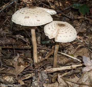Brown central umbo on egg-shaped cap bearing brownish scales that expands with age. White free gills and spore print. Brownish snakeskin pattern on tall thin white stipe which rises to full height before cap opens and breaks its connection to upper region. Movable double annulus. Saprotrophic. Edible.