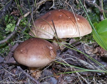 Orange-brown moist cap with grooved margin. Yellow gills spotted with reddish brown, reddish brown stipe. Inedible. Under BIRCH.