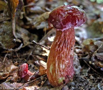 "Frost's Bolete" Cap apple-red aging duller w yllwsh areas. Pore surface exudes yllw droplets when young. Entire stipe boldly reticulate. Associated w bradleaf trees, esp. oak.