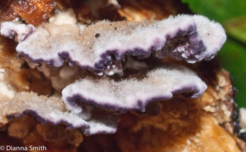 Smaller, hairier and grayer than T. biforme, violet on edge. White rotter on conifers. “Violet-toothed Polypore” Looks very similar to Trichaptum biforme, but is slightly smaller. The top of this annual fruiting body is a grayish-white, sometimes zoned hairy polypore cap. Often the caps are dressed in algae growth. Beneath some of the pores expand and break into spines. Thin outer edge of the hymenium is purple. Inner section is cream becoming brownish-yellow. It fruits on dead conifers. It is in the Hymenochaetaceae family of the Hymenochaetales order.