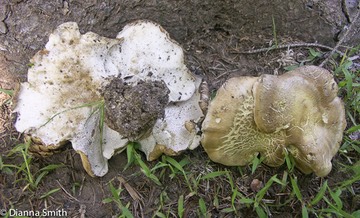 Dry, irregularly shaped brownish convex cap with a greenish tinge and a wavy margin. Context is dry, firm and buff. Tiny whitish pores are decurrent and whitish to greenish and become yellowish to reddish-brown with age. White spore print. Mycorrhizal with deciduous trees and occasionally conifers. Not edible. It is in the Albatrellaceae family of the Russulales.