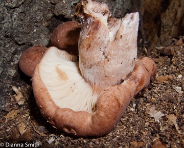 "Oak Milk-cap” In youth, it has thick white latex when the mushroom is young, which becomes watery with age. Red-brown somewhat ZONED cap with white dusting The stem darkens from the base upward as the mushroom matures. Somewhat fragrant odor, and mild to slightly acrid taste.